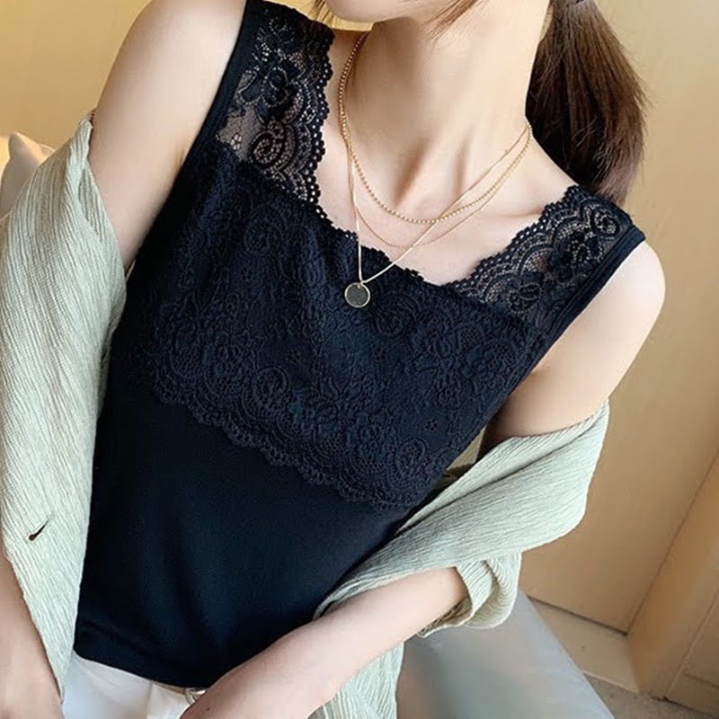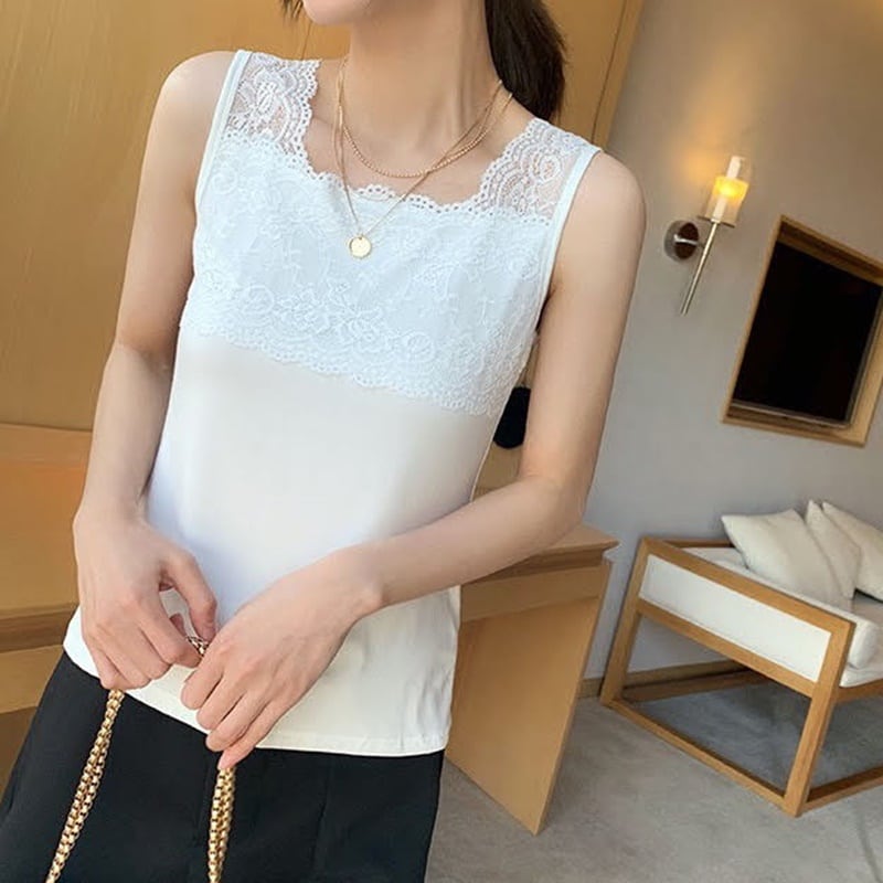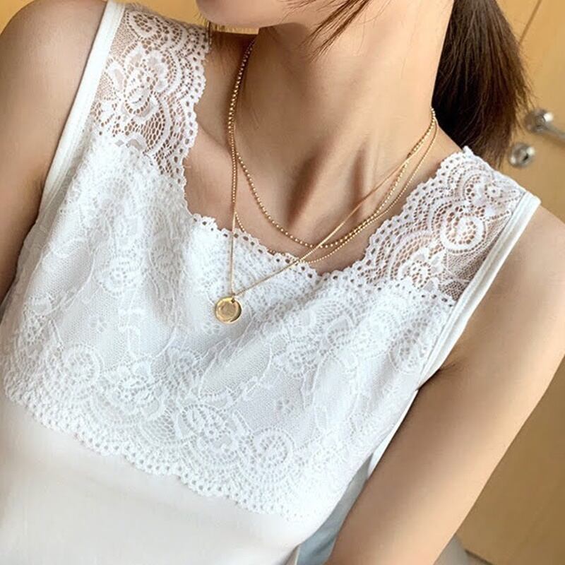 シンプルながらも上品なデザインが魅力のレースノースリーブトップ。