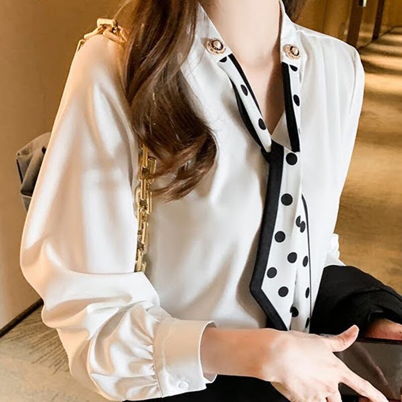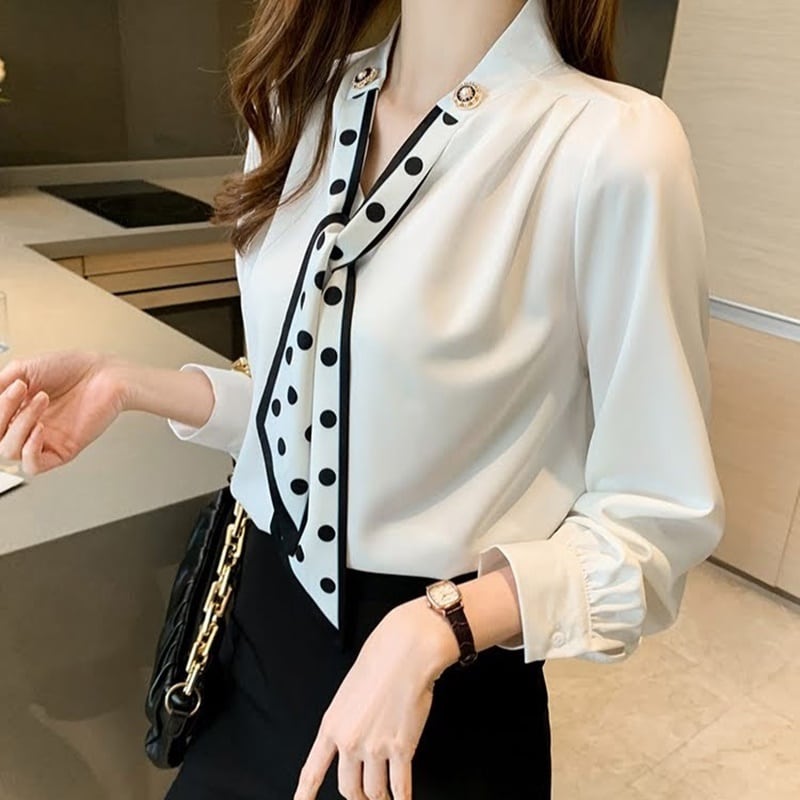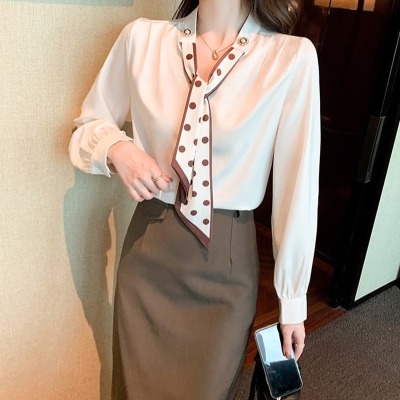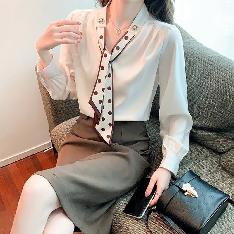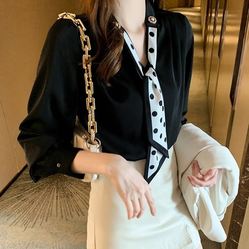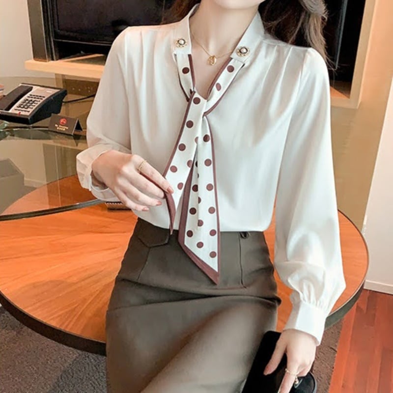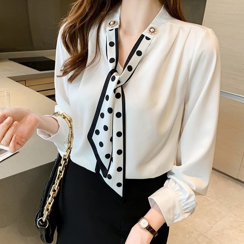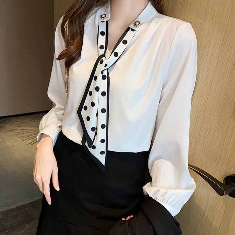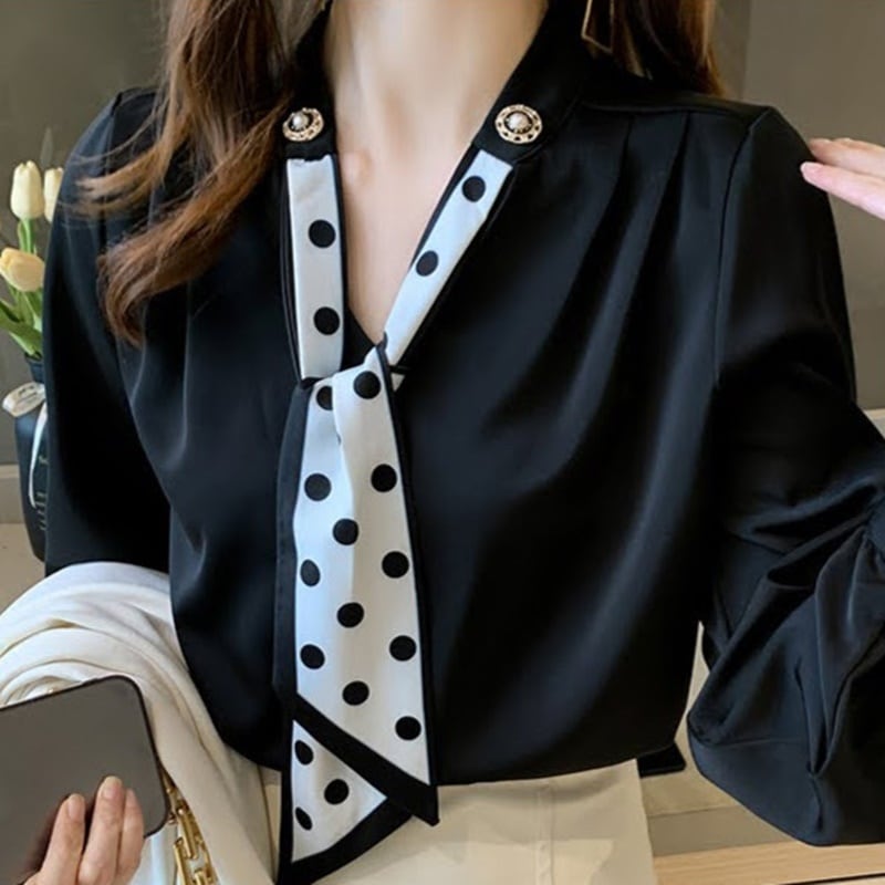 エレガントで上品なドット柄が魅力のスカーフシフォンブラウス。