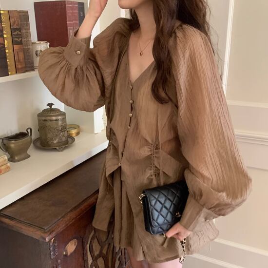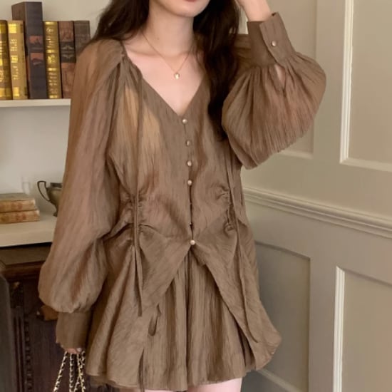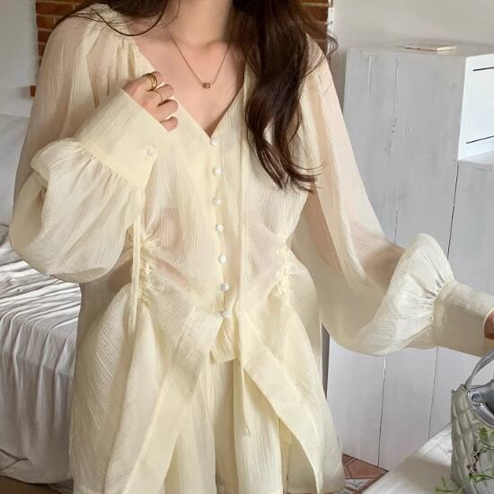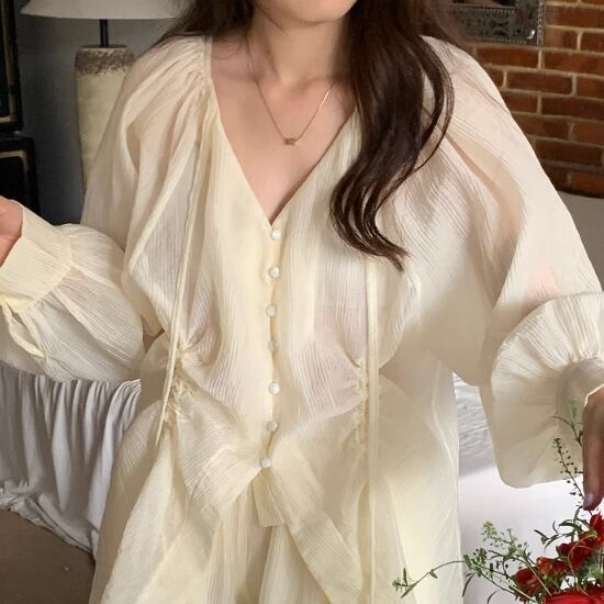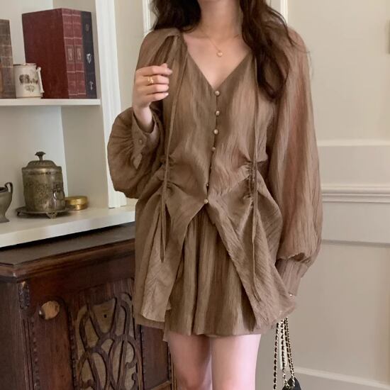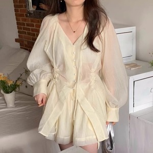 Vネックブラウスショートパンツセット 2色 10582